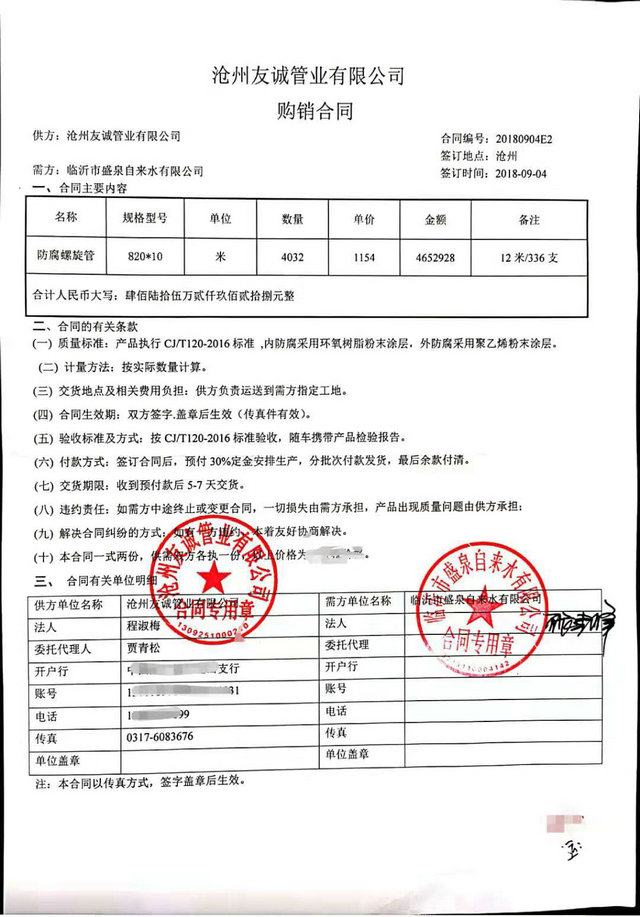 2018年9月我公司與沂州水務(wù)集團(tuán)臨沂市盛泉自來(lái)水有限公司簽訂TPEP防腐螺旋鋼管購(gòu)銷(xiāo)合同,DN800內(nèi)外防腐鋼管4000米,感謝張總的信任,與貴公司的合同讓我們公司在自來(lái)水管道領(lǐng)域有了一個(gè)新的突破,歡迎各界領(lǐng)域客戶前來(lái)合作。